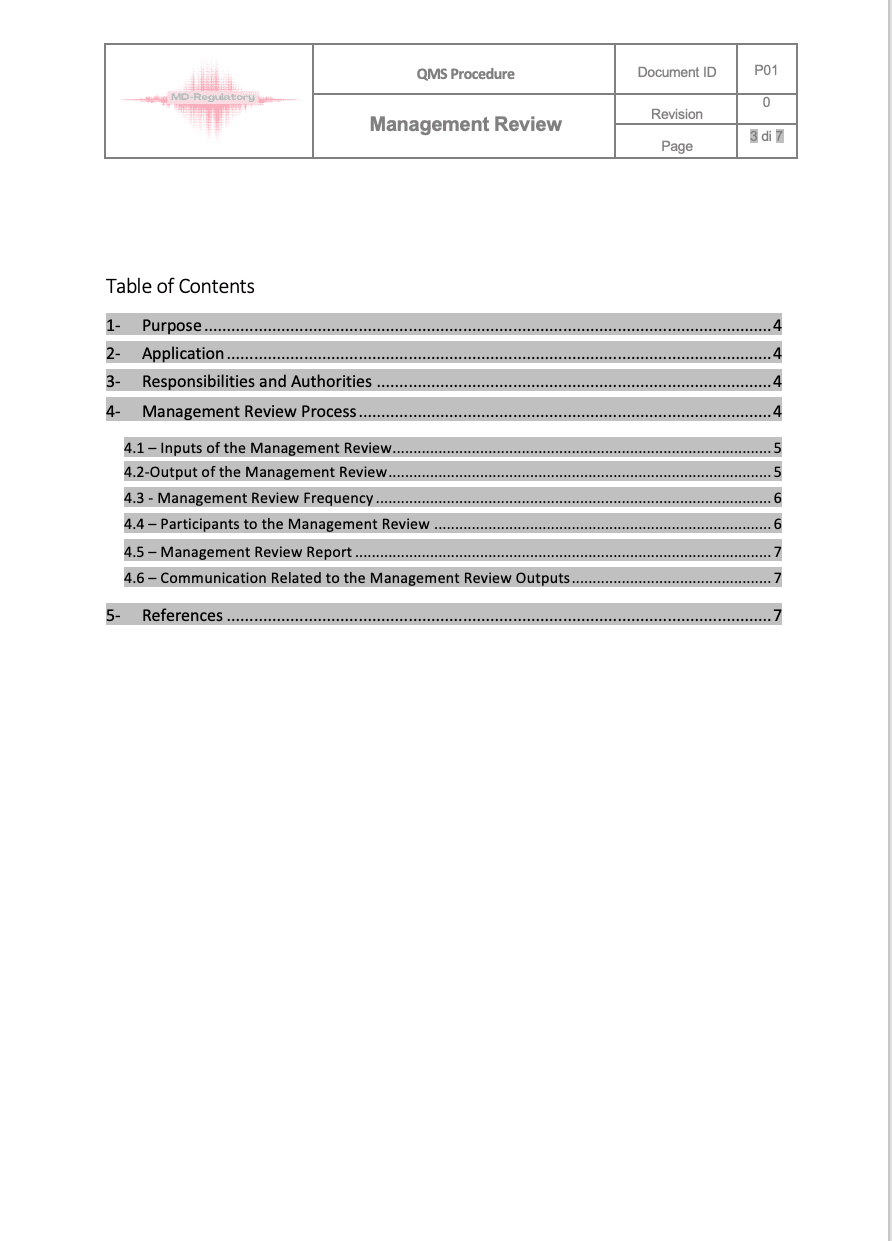 - P-01 Management Review Procedure — step-by-step instructions covering review frequency, required inputs (complaint data, audit results, CAPA status, PMS data, regulatory changes), outputs, responsibilities, and record requirements